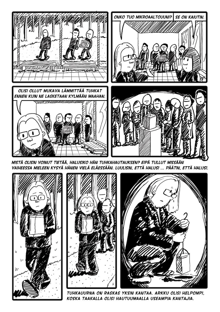 Traumaattinen tapahtuma saa ihmisen unohtamaan. Teos on koostettu surutyön aikana tekijän tuottamista muistiinpanoista - kirjoituksista, piirroksista ja sarjakuvista. Tapahtumat hyppivät ajassa ja paikassa surun ajatuksiin aiheuttaman kaaoksen lailla.